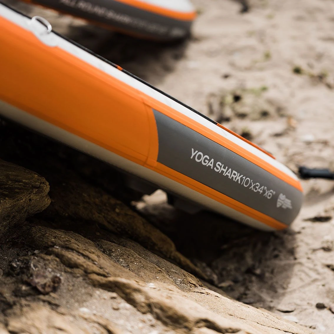Designed for those that want a SUP yoga board, the Shark 10′ x 34″x 6″ creates a high level of stability and buoyancy needed for fitness. The shark yoga share’s the same well proven attributes of the allround boards, whilst creating more stability from the width and higher volume as well as offering well-placed handles and paddle holder for use whilst exercising, a comfortable EVA deck pad with well placed and a carry strap for ease of getting the board to the waters edge.